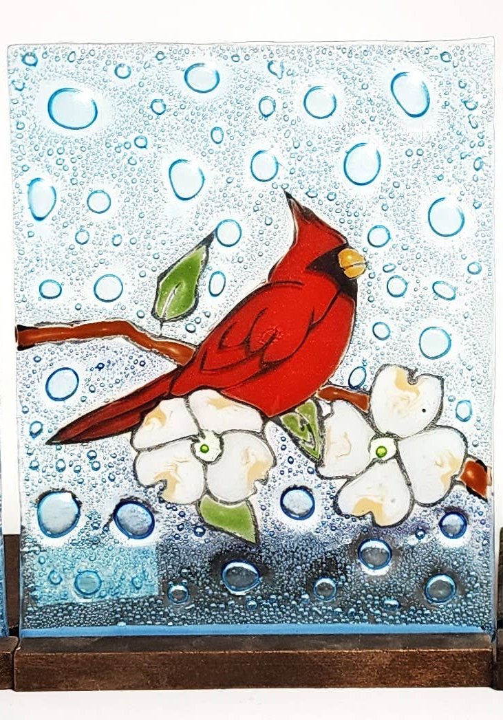 Tea Light Holder - Glass Art - Cardinal on Dogwood Flower