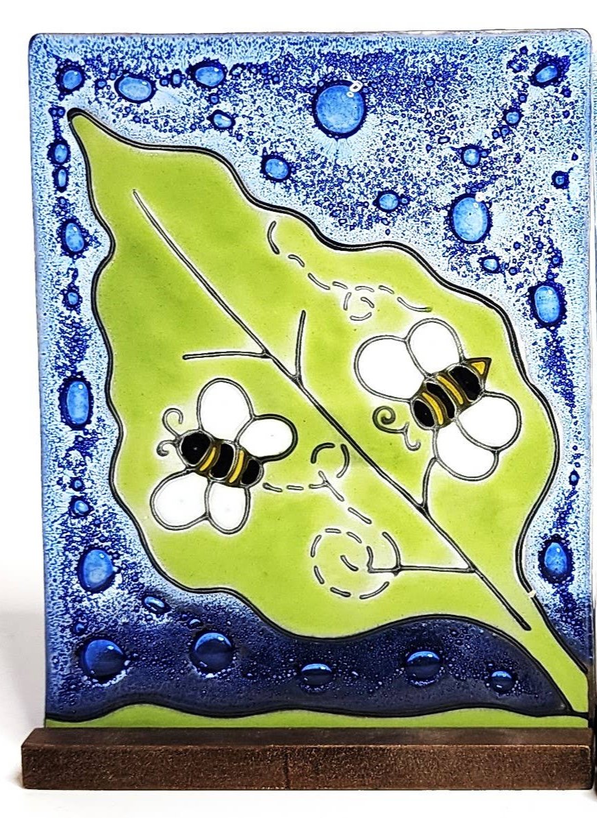 Handmade recycled glass with water-based paint. Beautifully made, this will be a great accent in anyone's home.