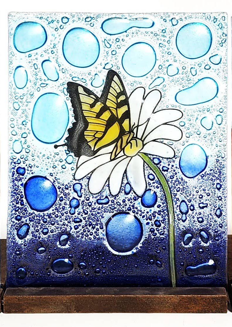 Handmade recycled glass with water-based paint. Beautifully made, this will be a great accent in anyone's home.