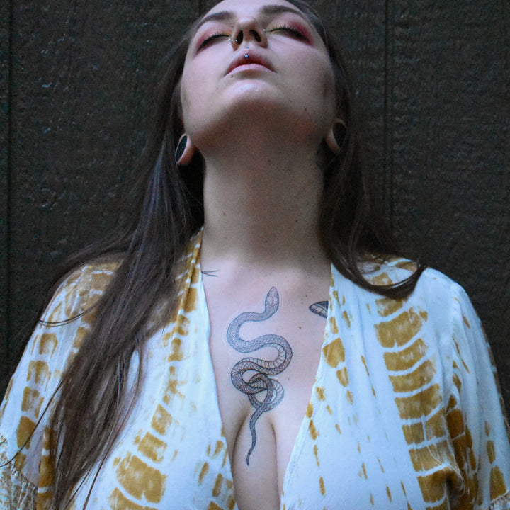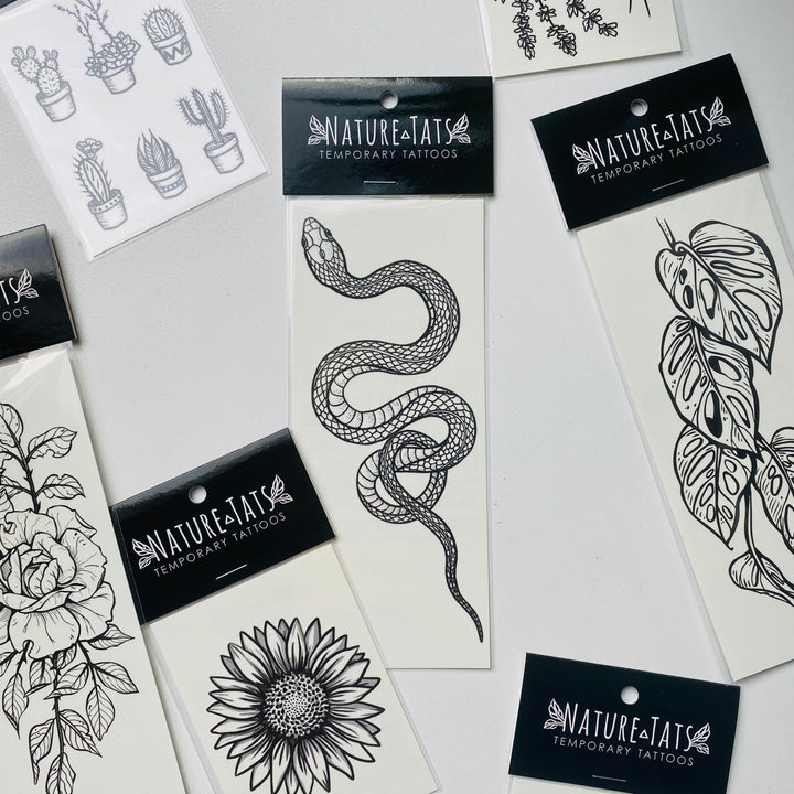 Garden snake temporary tattoo. Garden snakes, or garter snakes, are resilient and harmless to humans. They're incredibly beneficial creatures in various environment, making snacks of insects, frogs, and small animals, while helping to balance those populations. Garden snakes spend warm days nearby a water source, a pile of leaves and sticks, and wooded or grassy areas.