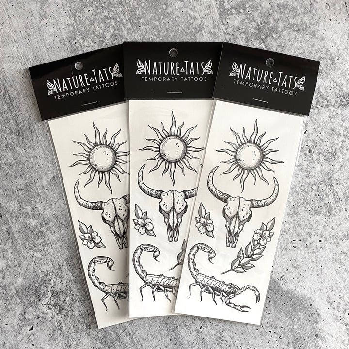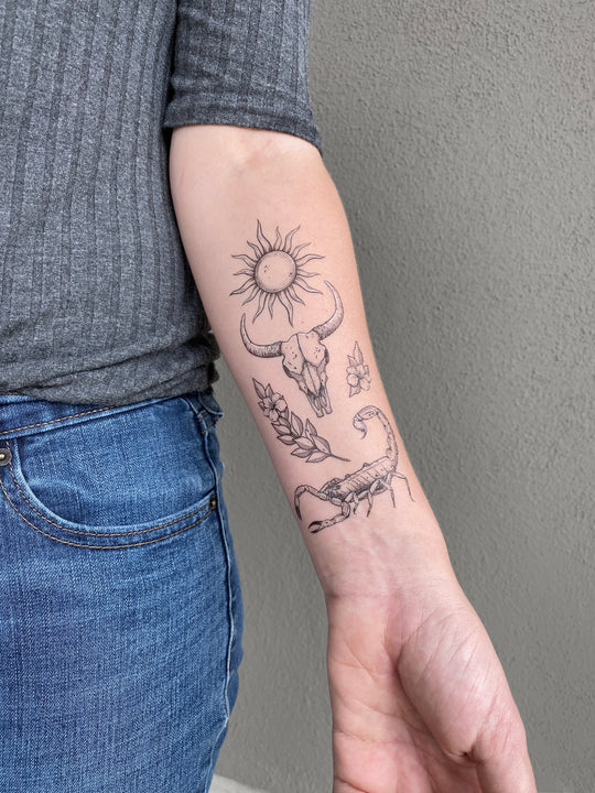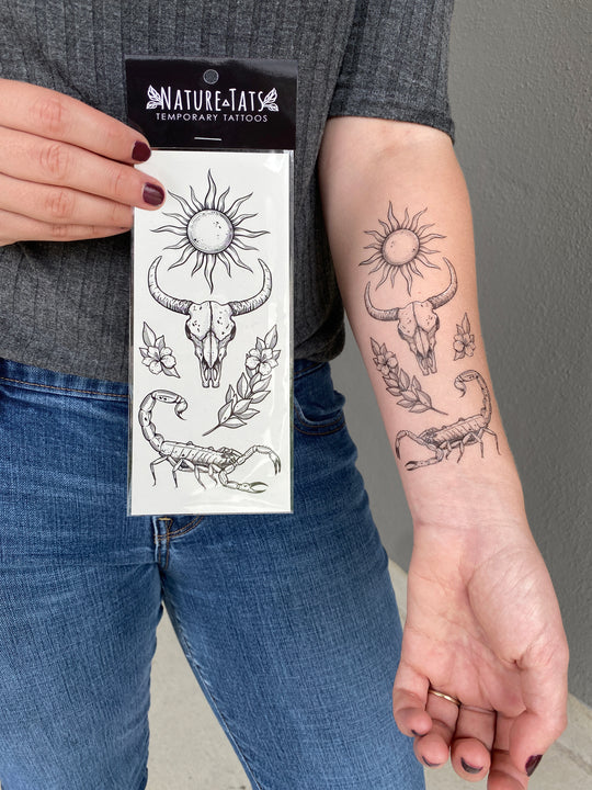 A hand-drawn collection of temporary tattoos inspired by the American Southwest scorching summers. Hand-drawn, original design in black ink with pops of white!