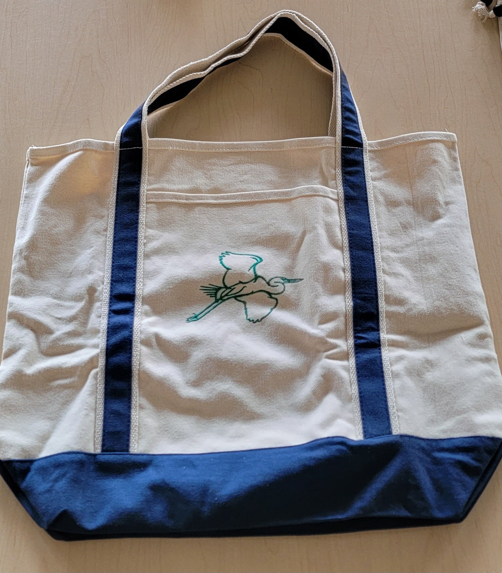This heavy canvas tote bag features an embroidered Great Egret on the front pocket. Roomy and sturdy, this tote bag can carry a lot!