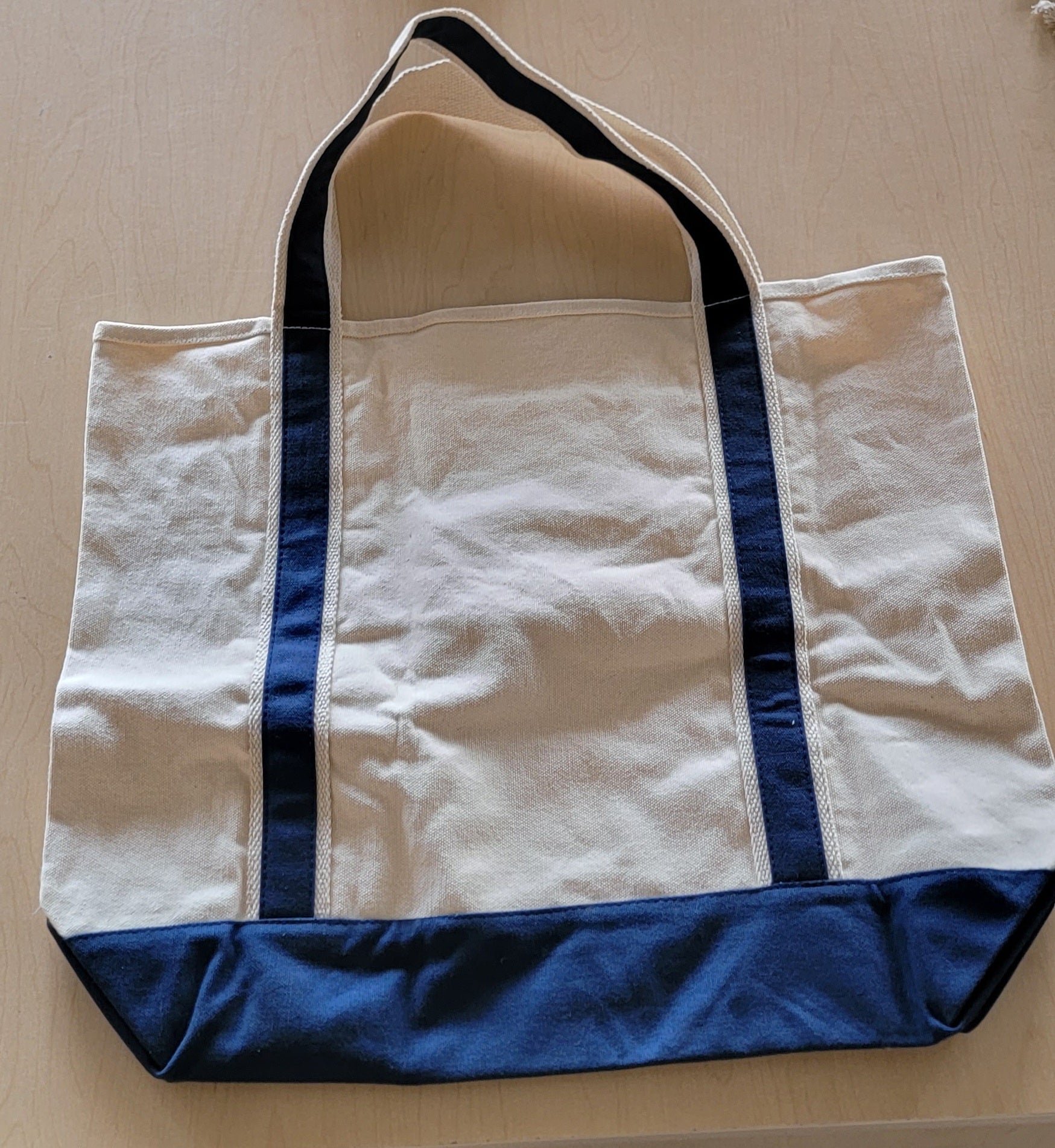 Tote bag is approximately 15.5" tall x 18.75" wide with a 5" bottom gusset. The front pocket is also quite roomy at about 7.75" wide and 10.75" deep. The double-layered handle has a 7" drop.