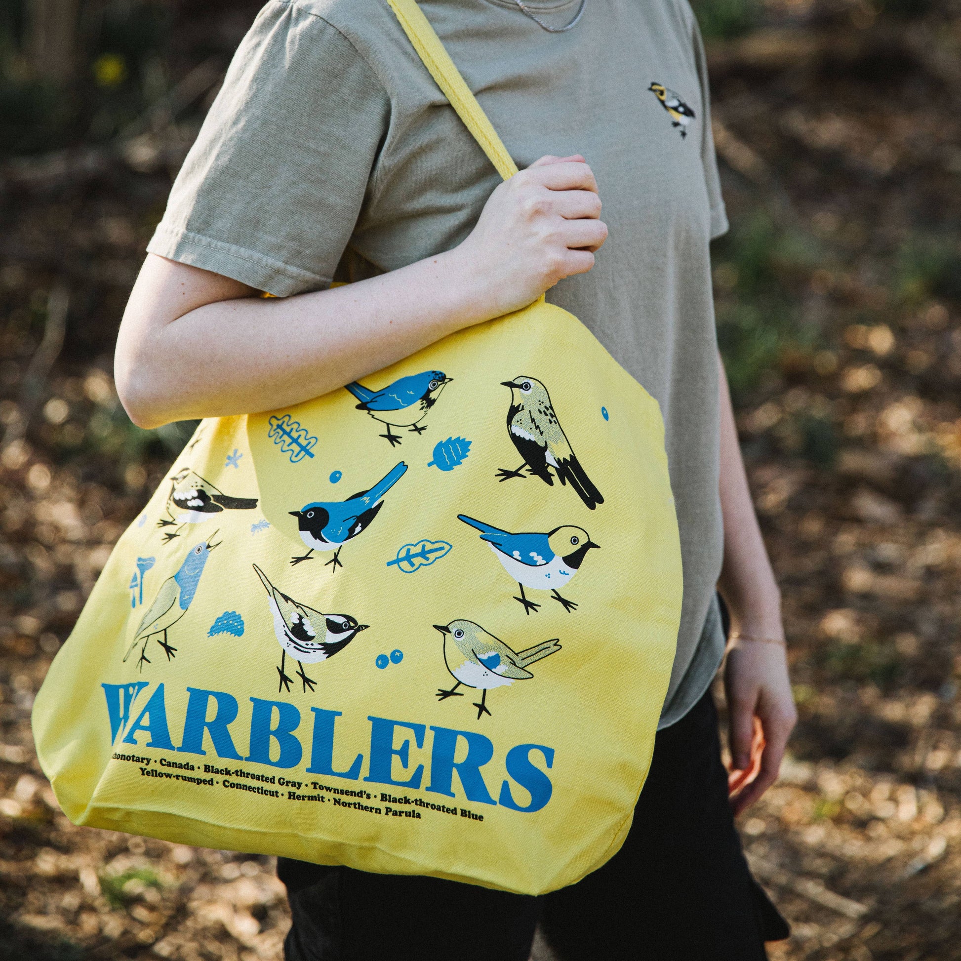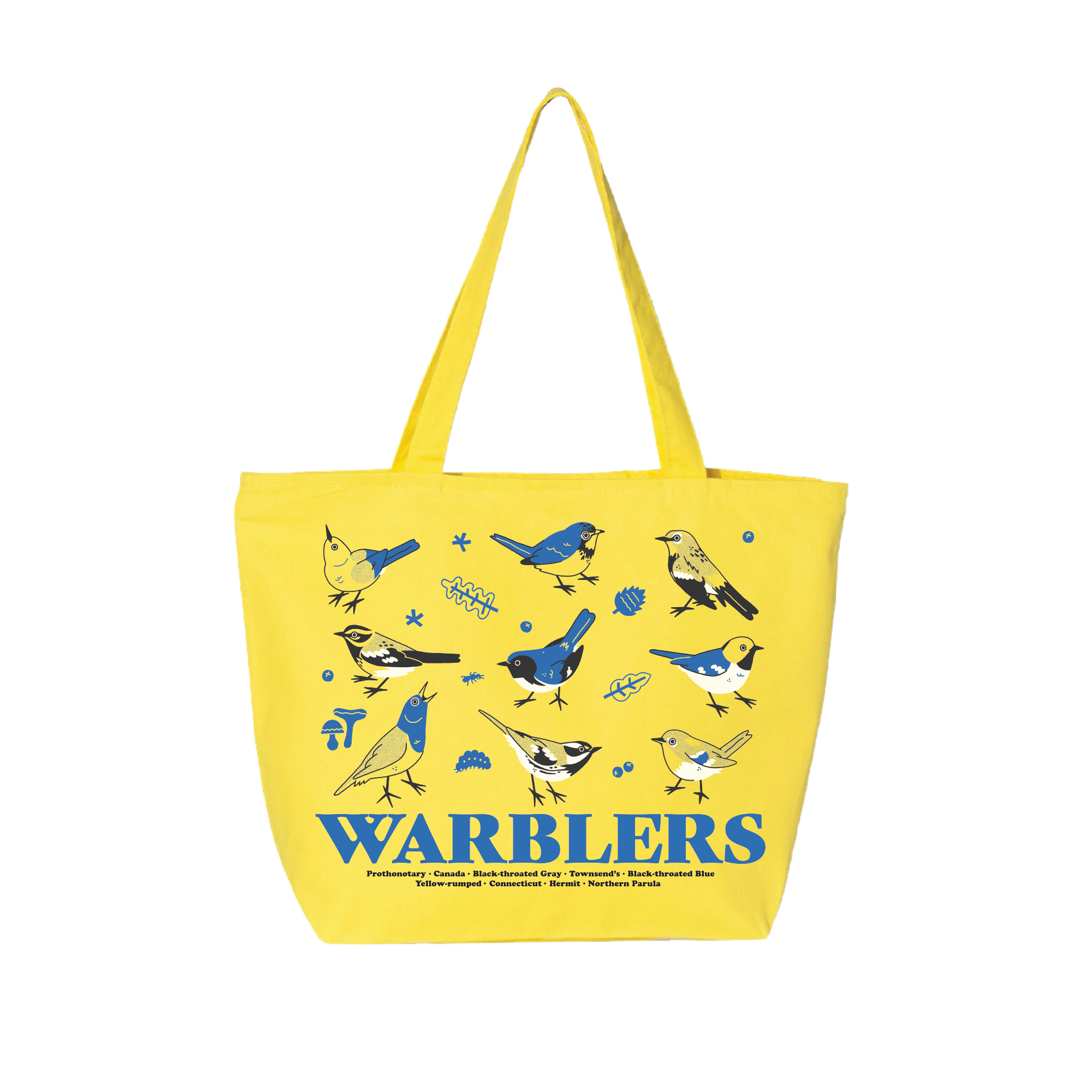 Bright and cheery, this heavyweight jumbo tote features nine charming warbler species.