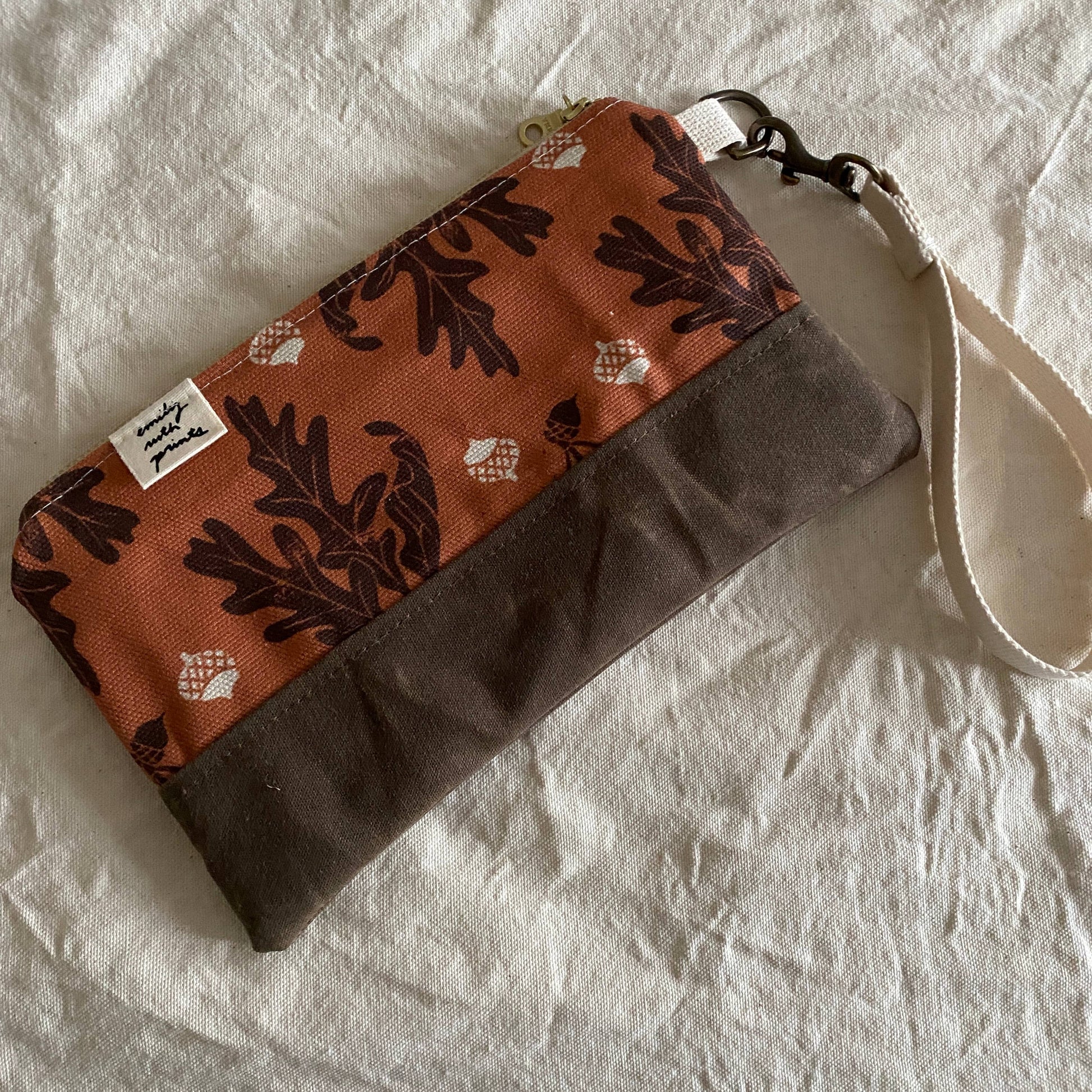 Anything but a simple zipper pouch, these wristlets have a detachable cotton strap and a waxed canvas detail. Each is made with digitally printed linen + cotton canvas and is fully lined.