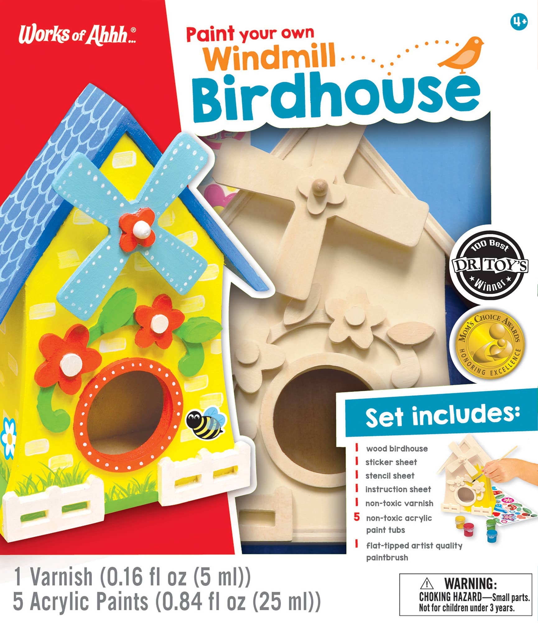 This Windmill Birdhouse Wood Craft & Paint Kit is made of real wood, and includes everything you need to create a beautiful work of art! The Windmill Birdhouse Wood Craft & Paint Kit is the perfect gift for every art loving kid! It includes 1 wood birdhouse, 1 stencil sheet, 1 sticker sheet, 1 non-toxic varnish, 5 non-toxic acrylic paint tubs, 1 flat-tipped artist-quality paintbrush, and 1 instruction sheet with painting guide.