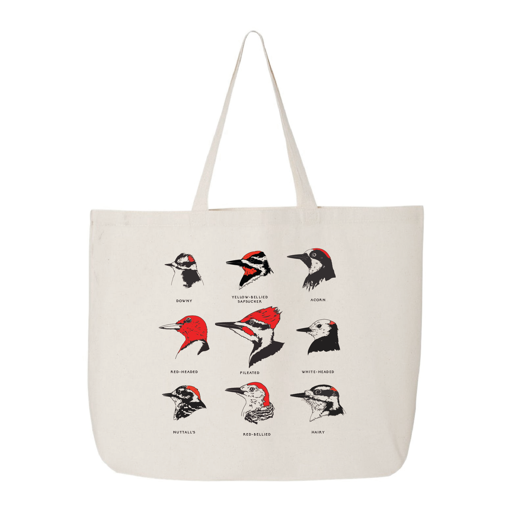 Downy or Hairy? This roomy tote featuring nine woodpecker profiles will help you remember the shape and patterning of your favorite Picidae family percussionists.